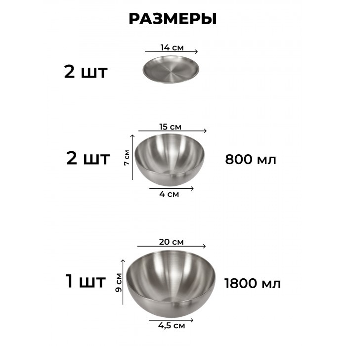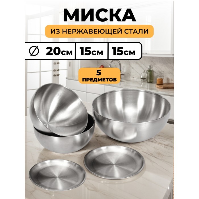 Набор Мисок из нержавеющей стали 3шт (15см- 2шт+20см-1шт +блюдце 14см-2шт) серебро 263334
