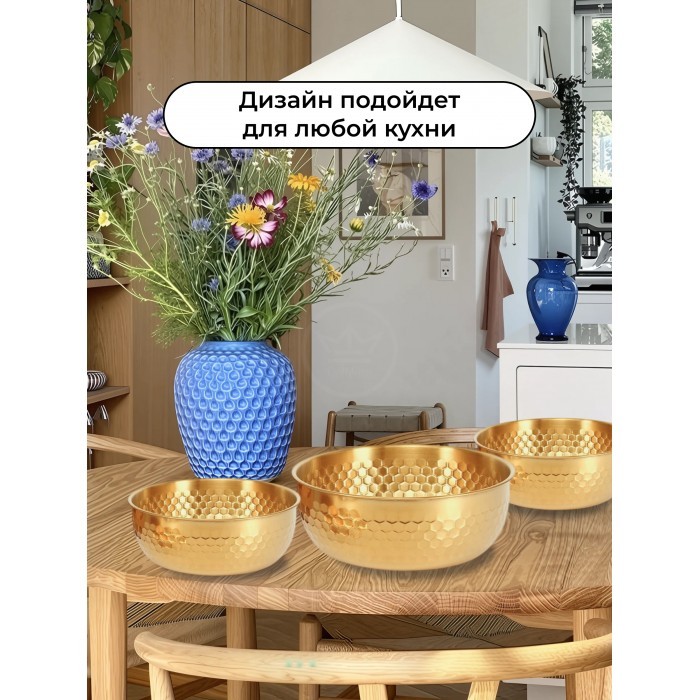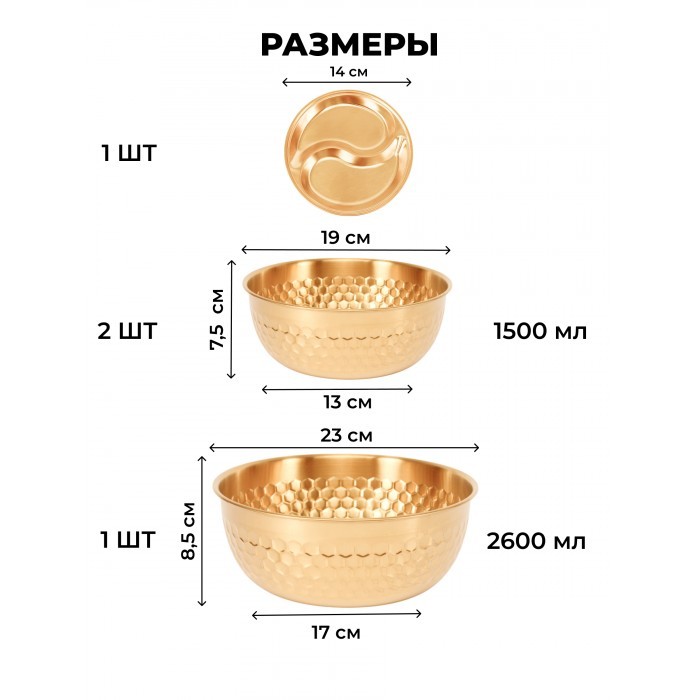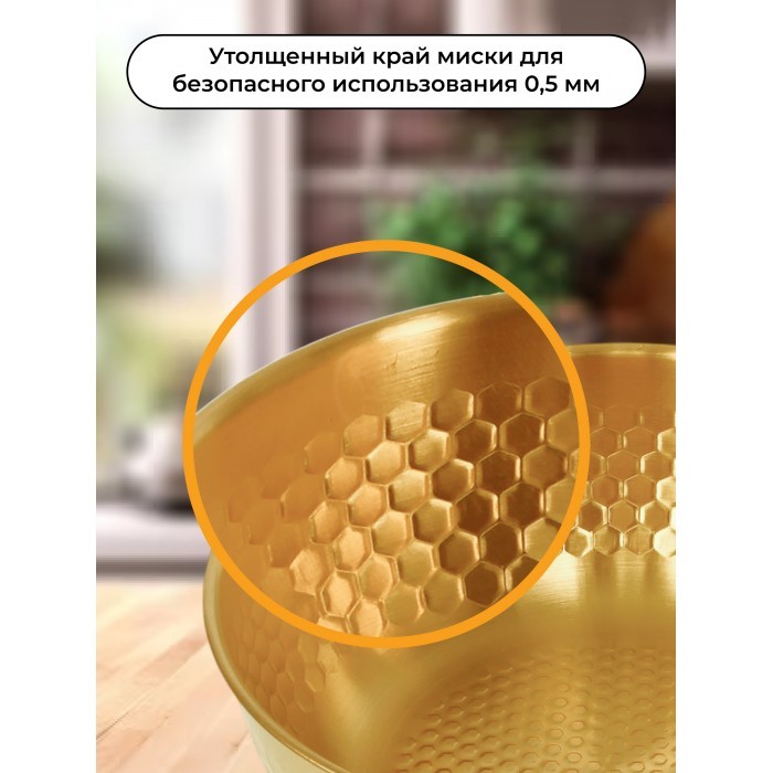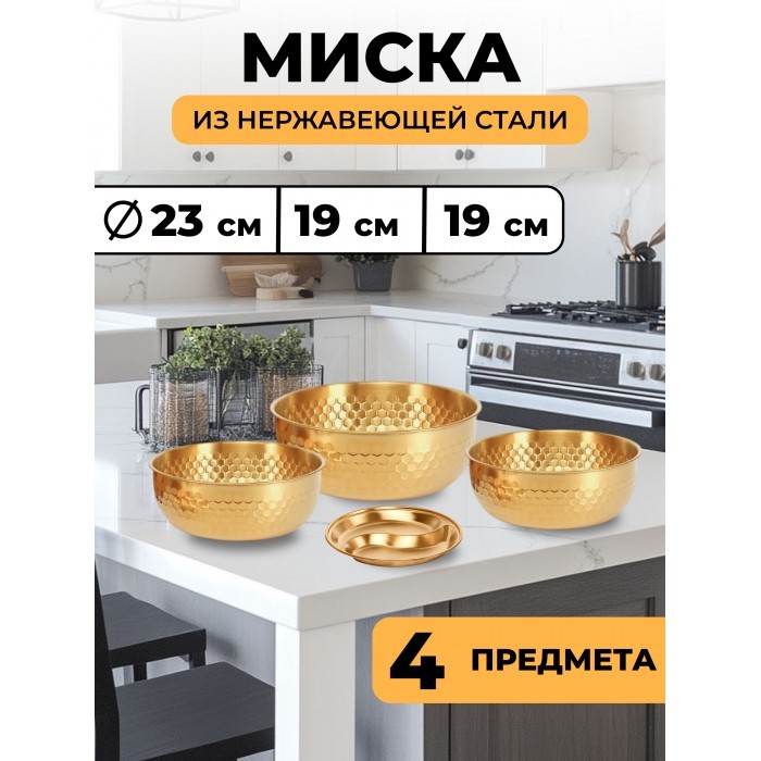 Набор Мисок из нержавеющей стали (соты) 3шт (19см-2шт+23см-1шт+менажница 14см) золото 265527