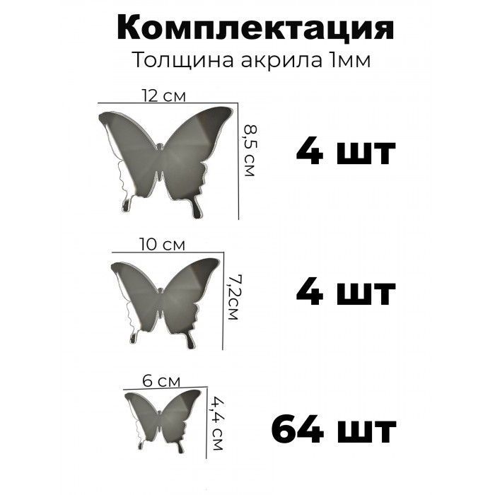 Интерьерные зеркальные наклейки Бабочки-2 набора ( 72 штук ) серебро 266107